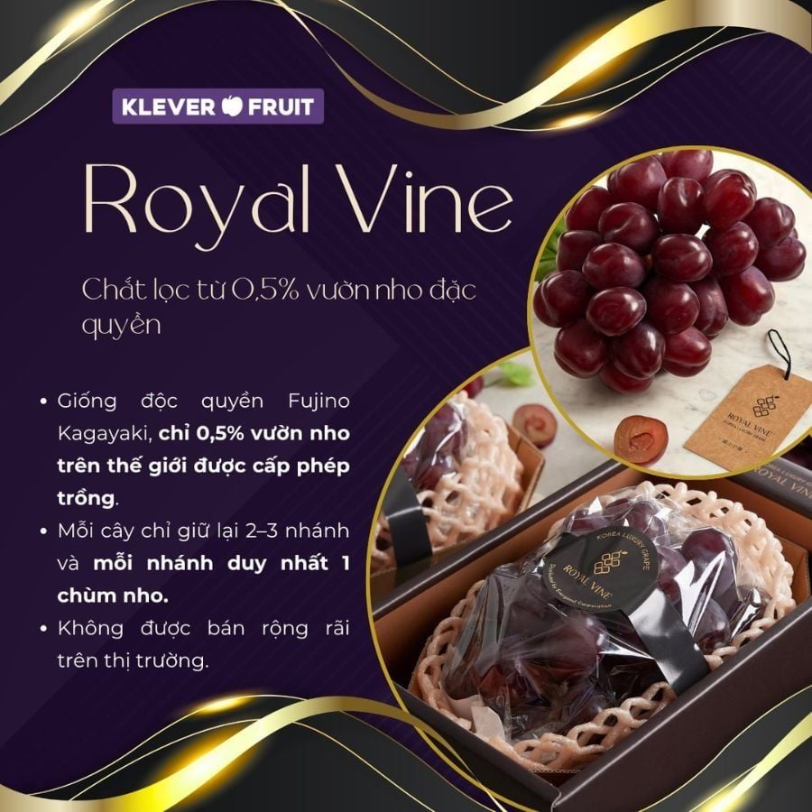 Nho Royal Vine là giống nho cao cấp, được phát triển bởi chuyên gia Tomio Shimura tại Nhật Bản và hiện nay được trồng tại các trang trại đạt chuẩn ở Hàn Quốc. Nhờ điều kiện khí hậu và kỹ thuật canh tác hiện đại, loại nho này giữ được chất lượng vượt trội, đảm bảo vị ngon đặc trưng và giá trị dinh dưỡng cao.